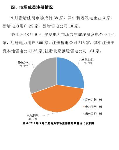 截止2018年9月,寧夏電力市場(chǎng)共完成注冊(cè)發(fā)電企業(yè)194家,注冊(cè)電力用戶300家,注冊(cè)售電公司216家,其中注冊(cè)寧夏本地售電公司32家,注冊(cè)北京推送售電公司184家。