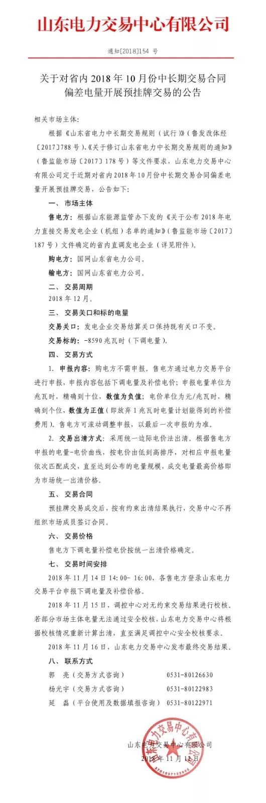山東關(guān)于對省內(nèi)2018年10月份中長期交易合同偏差電量開展預(yù)掛牌交易的公告