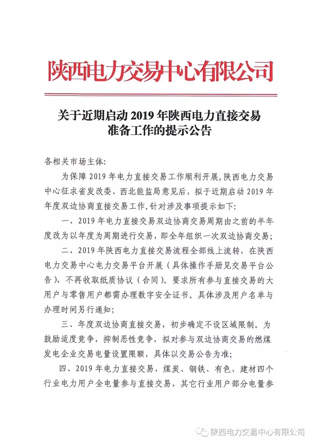 關(guān)于近期啟動2019年陜西電力直接交易準(zhǔn)備工作的提示公告