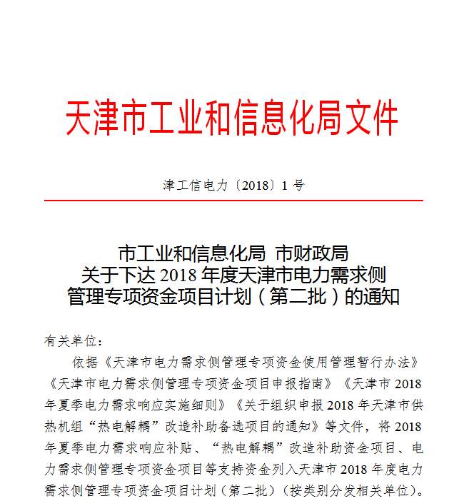 天津市發(fā)布了《關(guān)于下達(dá)2018年度天津市電力需求側(cè)管理專項(xiàng)資金項(xiàng)目計劃(第二批)的通知》