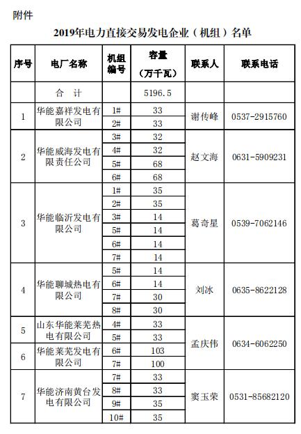 山東能監(jiān)辦發(fā)布了《關(guān)于公布2019年電力直接交易發(fā)電企業(yè)(機(jī)組)名單的通知》