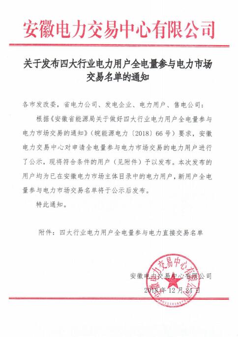 安徽電力交易中心發(fā)布了《關(guān)于發(fā)布四大行業(yè)電力用戶全電量參與電力市場(chǎng)交易名單的通知》