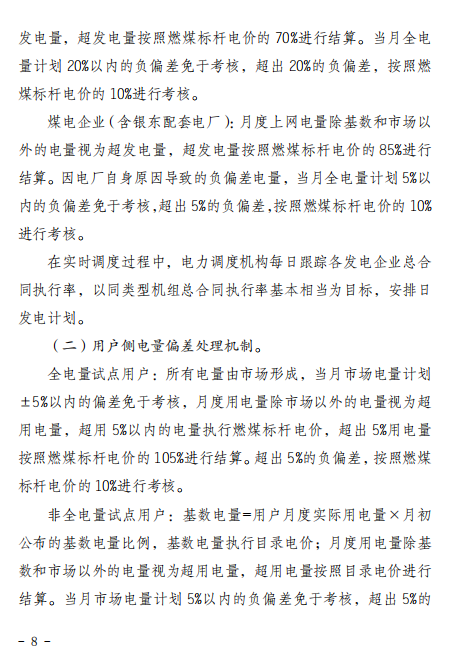全電量試點用戶:所有電量由市場形成,當(dāng)月市場電量計劃±5%以內(nèi)的偏差免于考核,月度用電量除市場以外的電量視為超用電量,超用5%以內(nèi)的電量執(zhí)行燃煤標(biāo)桿電價,超出 5%用電量按照燃煤標(biāo)桿電價的105%進(jìn)行結(jié)算。超出5%的負(fù)偏差,按照燃煤標(biāo)桿電價的10%進(jìn)行考核。非全電量試點用戶:基數(shù)電量=用戶月度實際用電量×月初公布的基數(shù)電量比例,基數(shù)電量執(zhí)行目錄電價;月度用電量除基數(shù)和市場以外的電量視為超用電量,超用電量按照目錄電價進(jìn)行結(jié)算。當(dāng)月市場電量計劃 5%以內(nèi)的負(fù)偏差免于考核,超出 5%的負(fù)偏差,按照燃煤標(biāo)桿電價的10%進(jìn)行考核。