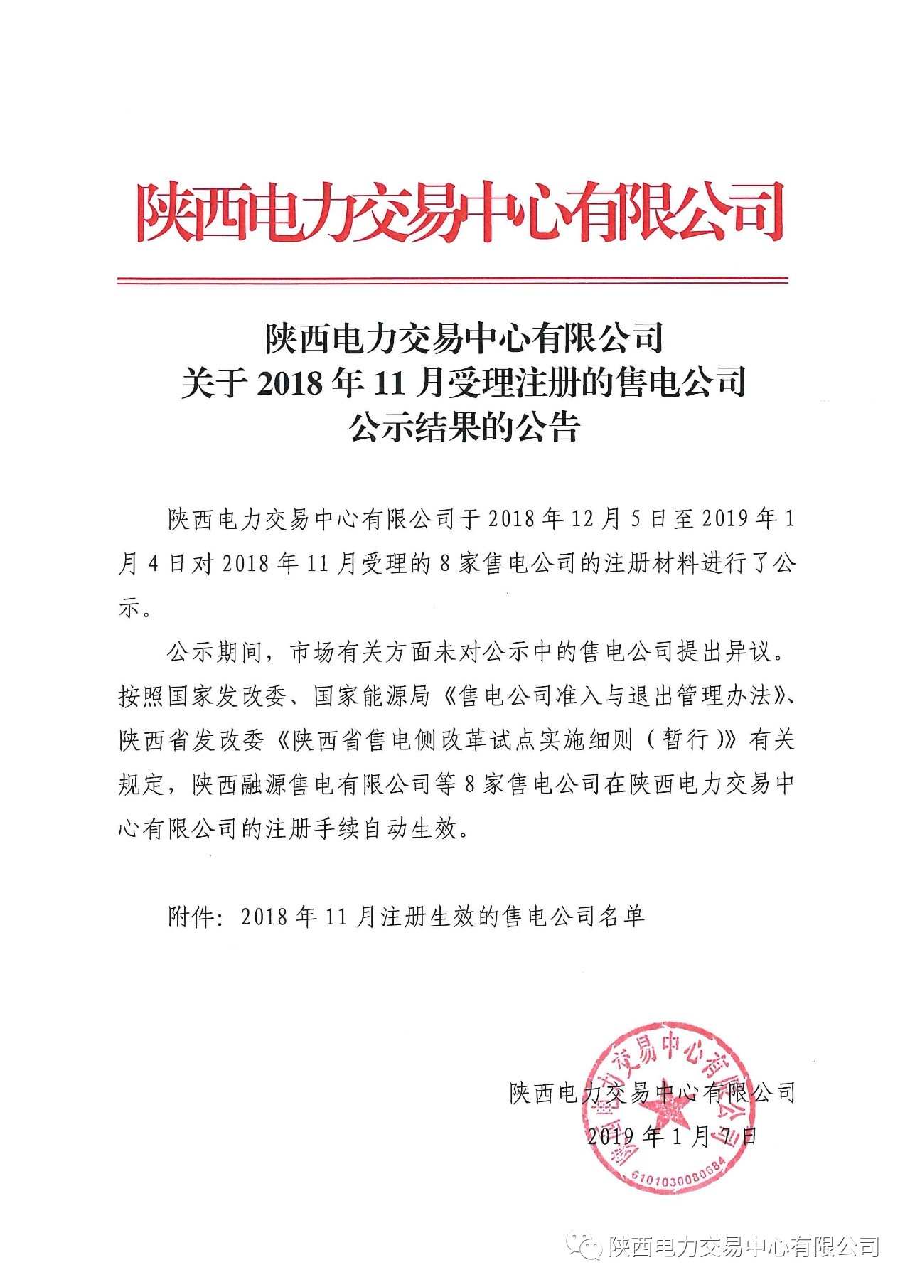 陜西發(fā)布了《關于2018年11月受理注冊的售電公司公示結果的公告》