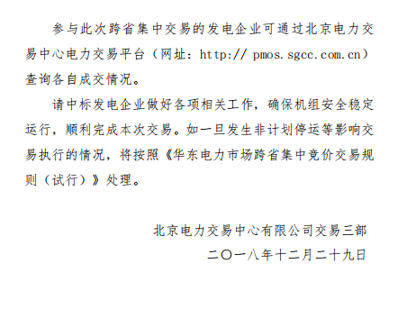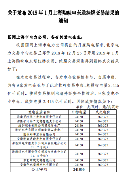 北京電力交易中心發(fā)布了《關于發(fā)布2019年1月上海購皖電東送掛牌交易結果的通知》