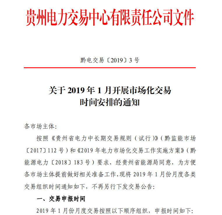 貴州關(guān)于2019 年1月開展市場化交易 時間安排的通知