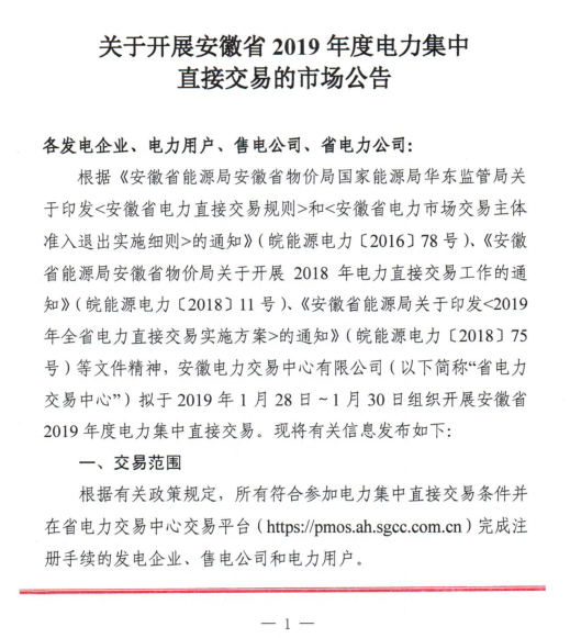 安徽擬于2019年1月28日~1月30日組織開展安徽省2019年度電力集中直接交易