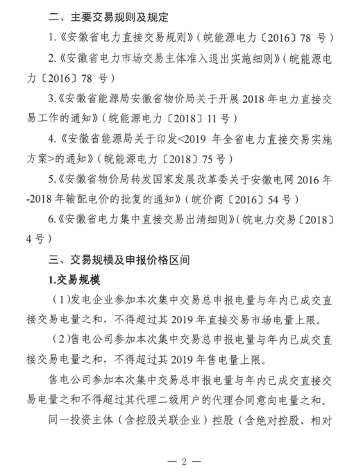 安徽電力交易中心有限公司擬于2019年1月28日~1月30日組織開展安徽省2019年度電力集中直接交易,售電公司參加本次集中交易總申報電量與年內(nèi)已成交直接交易電量之和,不得超過其2019年售電量上限。