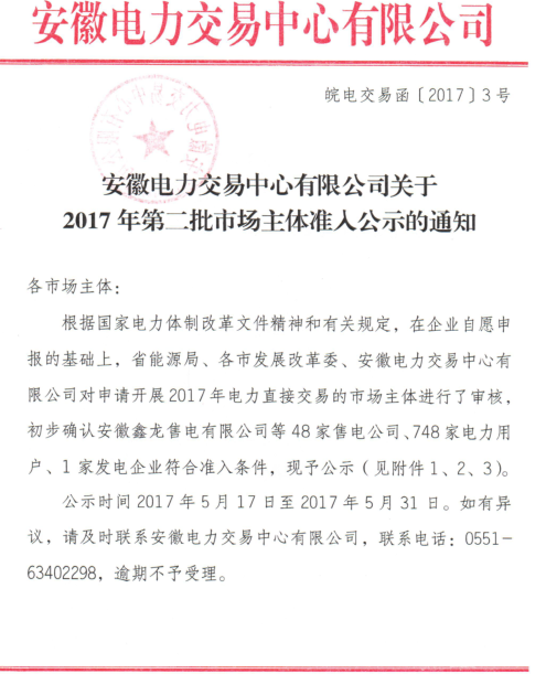 安徽電力交易中心新公示797家市場(chǎng)主體(第二批)