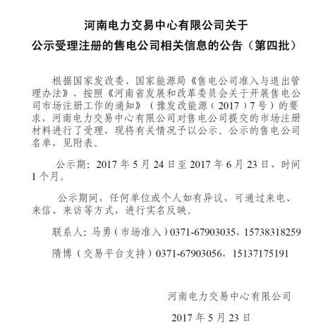 河南電力交易中心有限公司關(guān)于公示受理注冊的售電公司相關(guān)信息的公告(第四批)發(fā)布,一起來看公告全文: