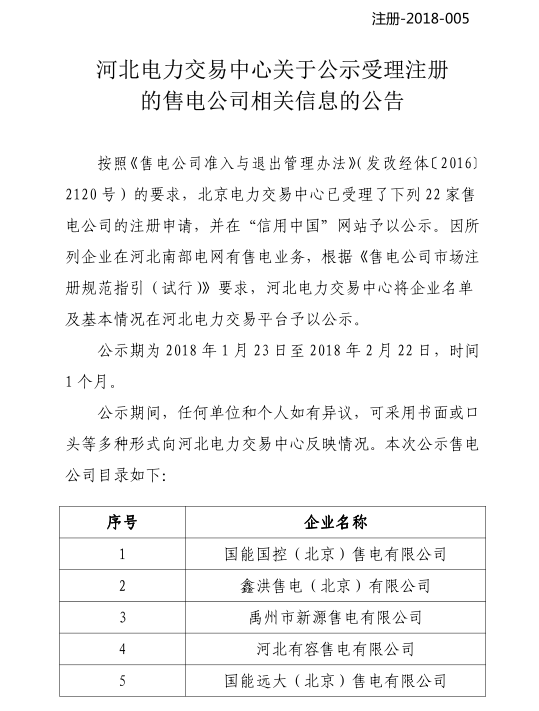 河北《關(guān)于公示受理注冊的售電公司相關(guān)信息的公告》 公示22家售電公司