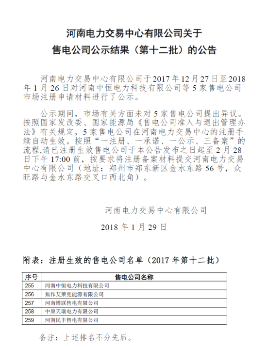 河南電力交易中心日前發(fā)布了關(guān)于售電公司公示結(jié)果(第十二批)的公告,公告中稱,于2017年12月27日至2018年1月26日對河南中恒電力科技有限公司等5家售電公司注冊申請材料進行了公示,未收到異議,注冊手續(xù)自動生效。
