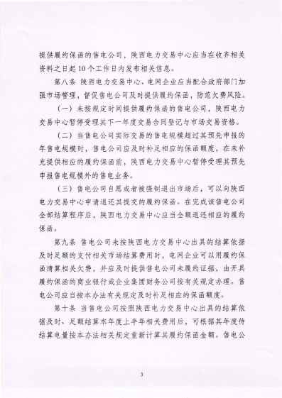 為規(guī)范陜西售電公司市場行為,防范電力市場欠費風險,保障市場各方利益,促進陜西電力市場健康有序發(fā)展,陜西電力交易中心有限公司根據(jù)陜西電力中長期交易工作實際情況,組織制定了《陜西電力市場售電公司履約保函管理辦法(試行)》。參與陜西電力市場的售電公司應于每年11月底前向陜西電力交易中心提供其資產(chǎn)總額證明材料、申報預計年售電規(guī)模等信息,原文如下: