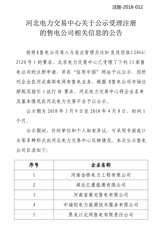 河北電力交易中心日前發(fā)布了關(guān)于公示受理注冊(cè)的售電公司相關(guān)信息的公告,河北電力交易中心受理了北京電力交易中心推送的在河北南部電網(wǎng)有售電業(yè)務(wù)的13家售電公司,詳情如下: