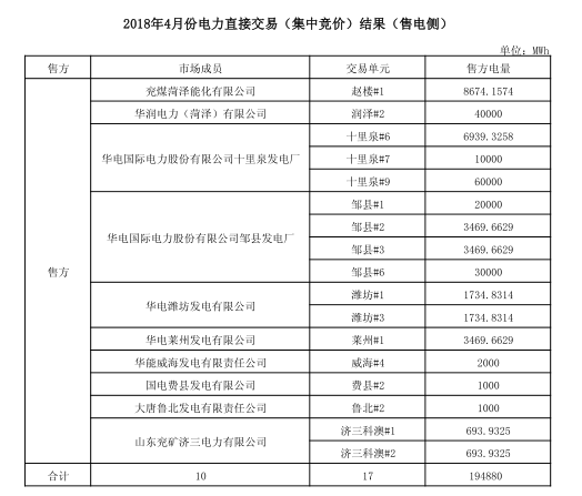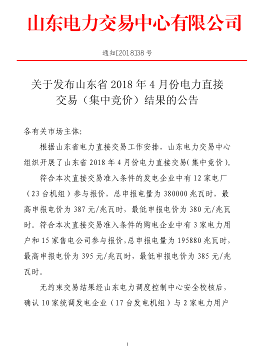 山東電力交易中心日前發(fā)布了《山東省2018年4月份電力直接交易(集中競價(jià))結(jié)果》,確認(rèn)10家統(tǒng)調(diào)發(fā)電企業(yè)(17臺發(fā)電機(jī)組)與2家電力用戶及15家售電公司達(dá)成交易電量194880兆瓦時(shí),統(tǒng)一出清價(jià)為386元/兆瓦時(shí)。