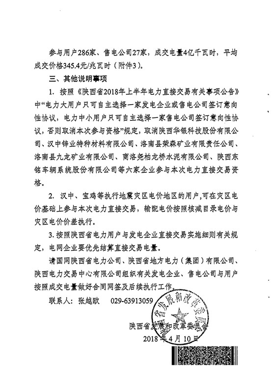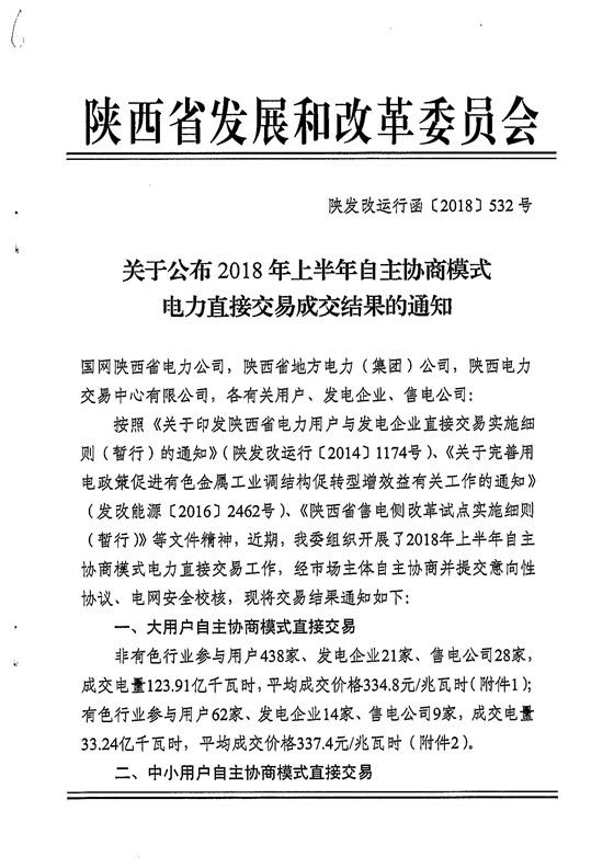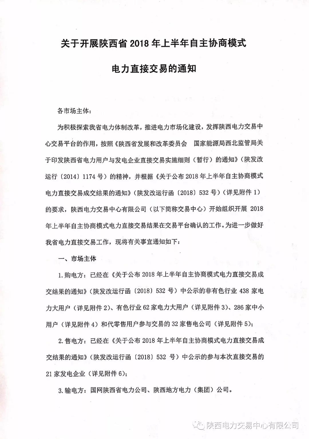 陜西電力交易中心日前發(fā)布了《關(guān)于開展陜西省2018年上半年自主協(xié)商模式電力直接交易的通知》,通知中稱,購電方:已經(jīng)在《關(guān)于公布2018年上半年自主協(xié)商模式電力直接交易成交結(jié)果的通知》(陜發(fā)改運(yùn)行函〔2018〕532號(hào))中公示的非有色行業(yè)438家電力大用戶、有色行業(yè)62家電力大用戶、286家中小用戶和代零售用戶參與交易的32家售電公司。