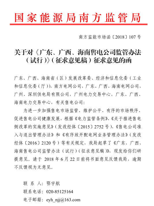 《廣東、廣西、海南售電公司監(jiān)管辦法(試行)》公開(kāi)征求意見(jiàn):對(duì)三類(lèi)售電公司同時(shí)監(jiān)管