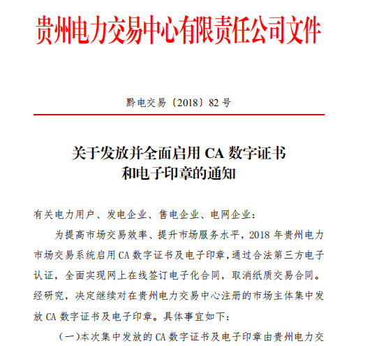 貴州電力交易中心今日發(fā)布了《關于發(fā)放并全面啟用CA數(shù)字證書和電子印章的通知》,決定繼續(xù)對在貴州電力交易中心注冊的電力用戶、發(fā)電企業(yè)、