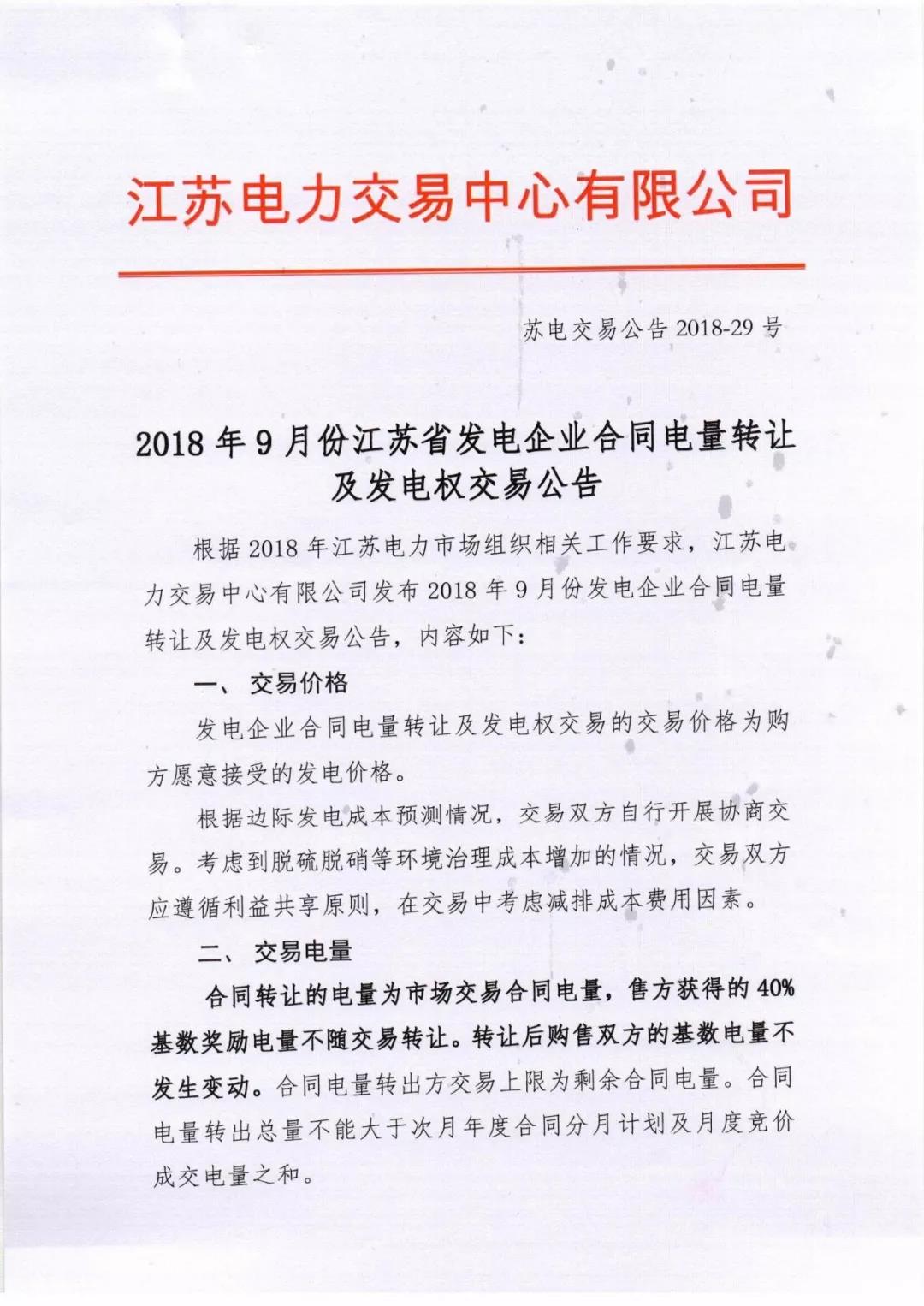 2018年9月份江蘇省發(fā)電企業(yè)合同電量轉(zhuǎn)讓及發(fā)電權(quán)交易公告