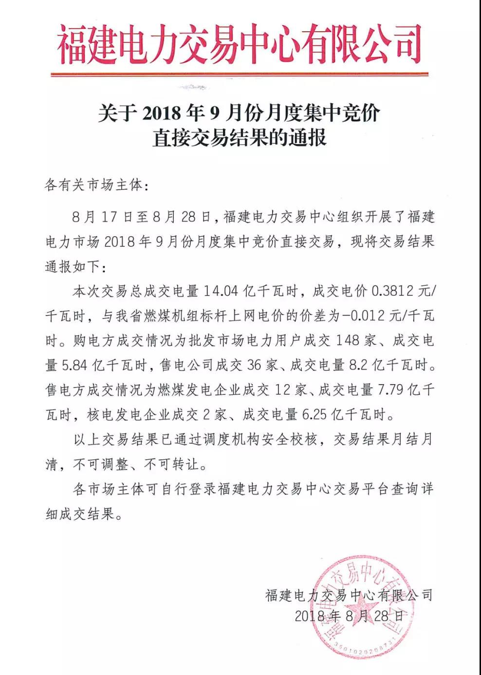 福建關(guān)于2018年9月份月度集中競價直接交易結(jié)果的通報