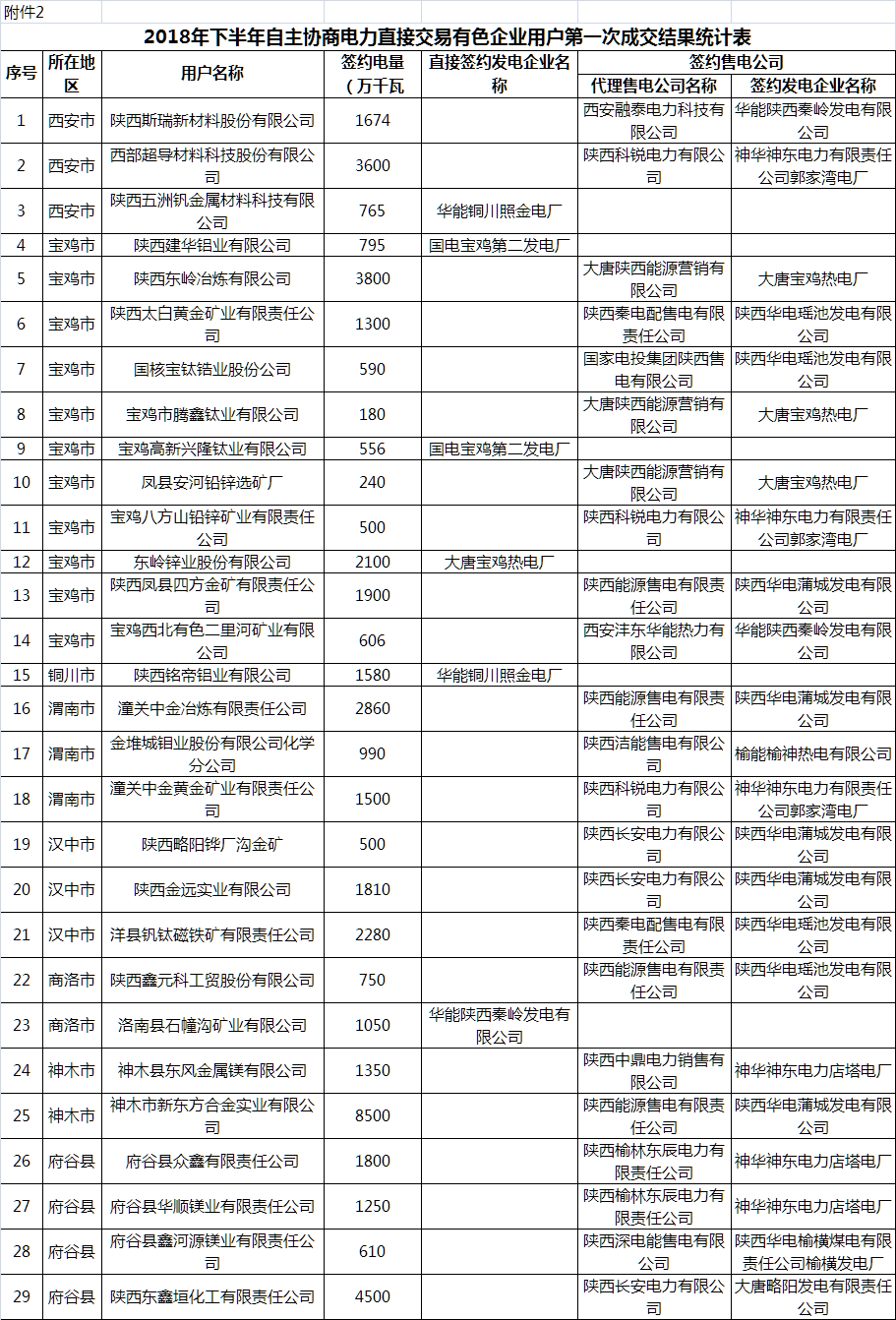 2、2018年下半年自主協(xié)商電力直接交易有色企業(yè)用戶(hù)第一次成交結(jié)果統(tǒng)計(jì)表