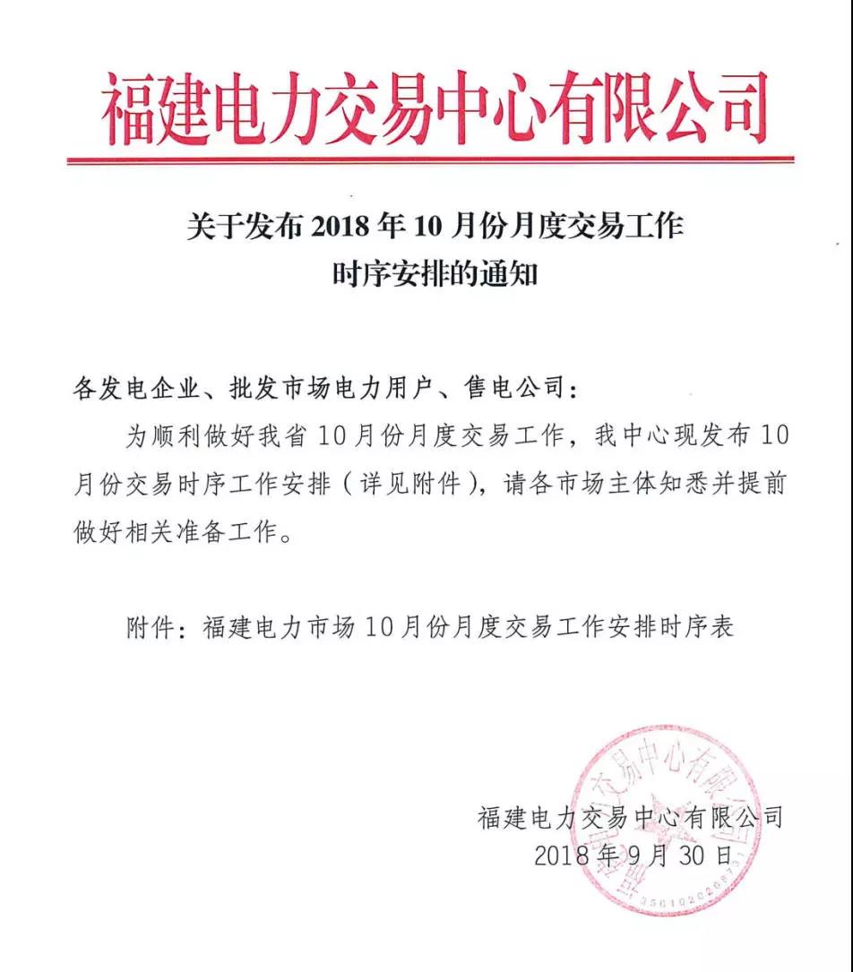 福建關(guān)于發(fā)布2018年10月份月度交易工作時序安排的通知