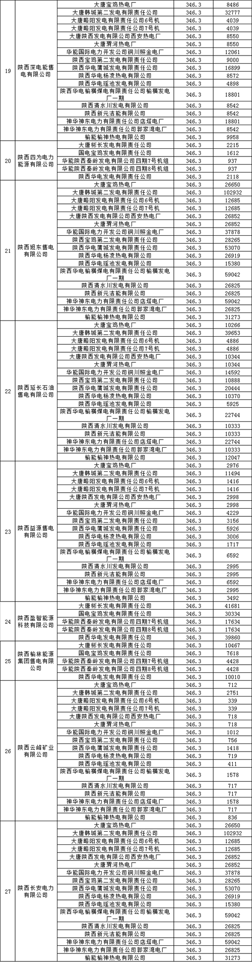現(xiàn)將我省下半年集中競價模式電力直接交易成交結(jié)果清單予以公布,請陜西省電力公司、陜西省地方電力(集團(tuán))公司、陜西電力交易中心有限公司組織各發(fā)電企業(yè)與用戶做好合同網(wǎng)簽及后續(xù)落實工作。