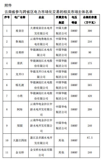 售電方:根據(jù)國家能源局批復(fù)的《南方區(qū)域跨區(qū)跨省電力中長期交易規(guī)則(暫行)》(以下簡稱“交易規(guī)則”)并結(jié)合云南政府相關(guān)部門意見,目前為云南16家水電廠,具體名單見附件。