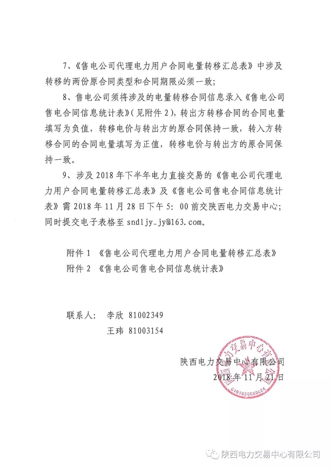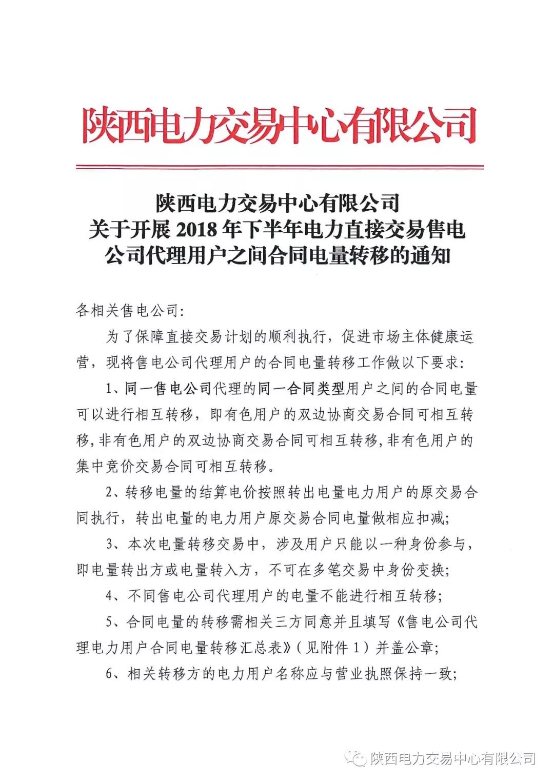陜西電力交易中心有限公司關(guān)于開(kāi)展2018年下半年電力直接交易售電公司代理用戶之間合同電量轉(zhuǎn)移的通知