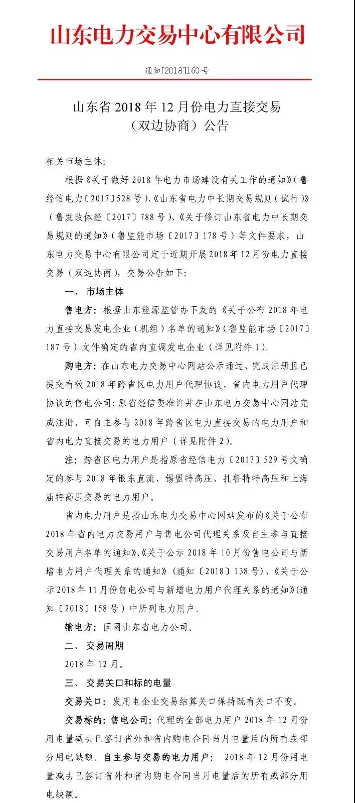 山東省2018年12月份電力直接交易(雙邊協(xié)商)公告