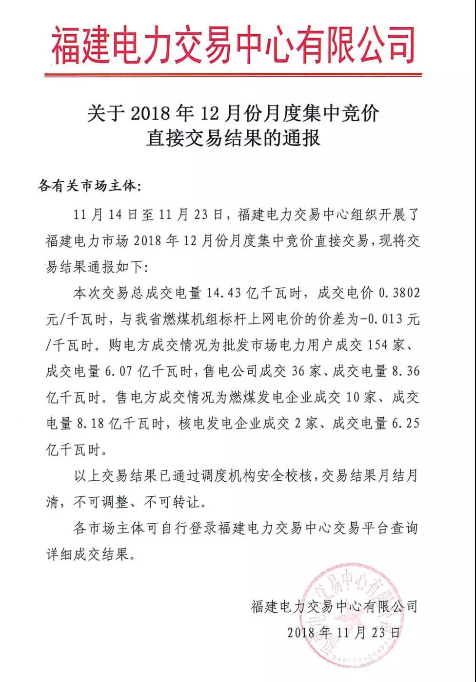 福建關(guān)于2018年12月份月度集中競(jìng)價(jià)直接交易結(jié)果的通報(bào)