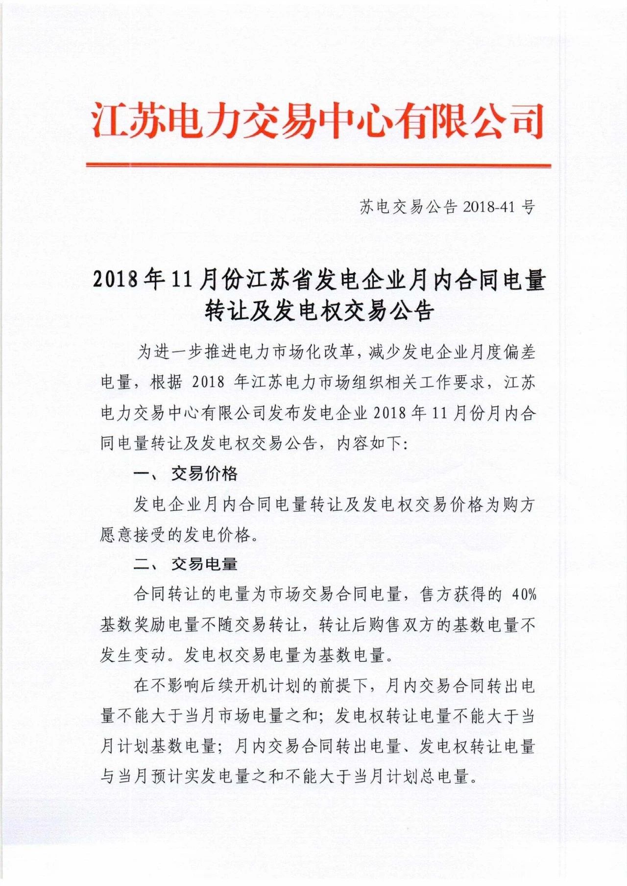 江蘇2018年11月發(fā)電企業(yè)月內(nèi)合同電量轉(zhuǎn)讓及發(fā)電權(quán)交易11月30日申報(bào)