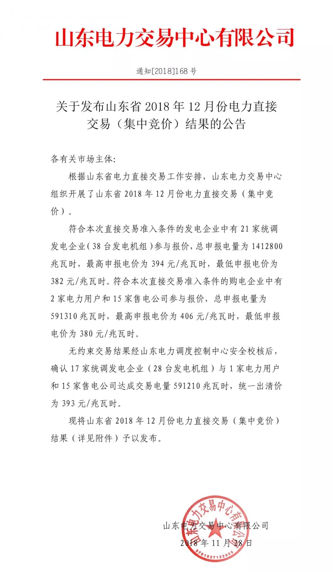 關(guān)于發(fā)布山東省2018年12月份電力直接交易(集中競(jìng)價(jià))結(jié)果的公告