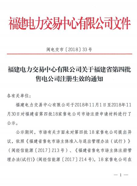 據(jù)悉,福建電力交易中心日前發(fā)布了《關(guān)于福建省第四批售電公司注冊(cè)生效的通知》,第四批18家售電公司注冊(cè)手續(xù)自動(dòng)生效。