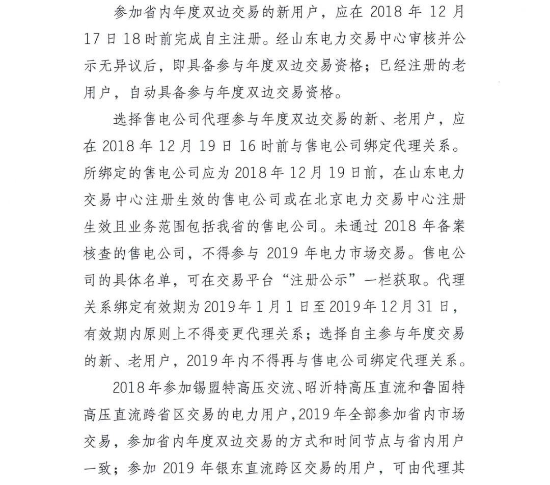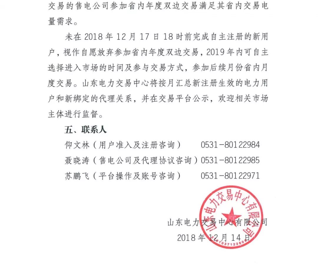 山東電力交易中心日前發(fā)布了《關于開展2019年新增電力市場交易用戶自主注冊及售電公司與電力用戶代理關系綁定工作的通知》,參加省內年度雙邊交易的新用戶,應在2018年12月17日18時前完成自主注冊。