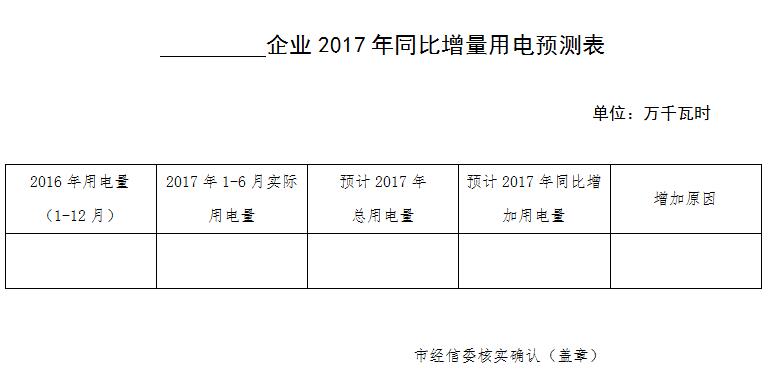 五、各縣(市、區(qū))經(jīng)信局要認(rèn)真組織企業(yè),根據(jù)年內(nèi)生產(chǎn)安排和項(xiàng)目投運(yùn)情況,實(shí)事求是地做好年度用電預(yù)測(cè)工作,并組織符合條件的企業(yè)填寫(xiě)年度增量用電預(yù)測(cè)表,務(wù)于7月11日前將屬地內(nèi)電力用戶(hù)增量用電情況以正式文件報(bào)市經(jīng)信委。