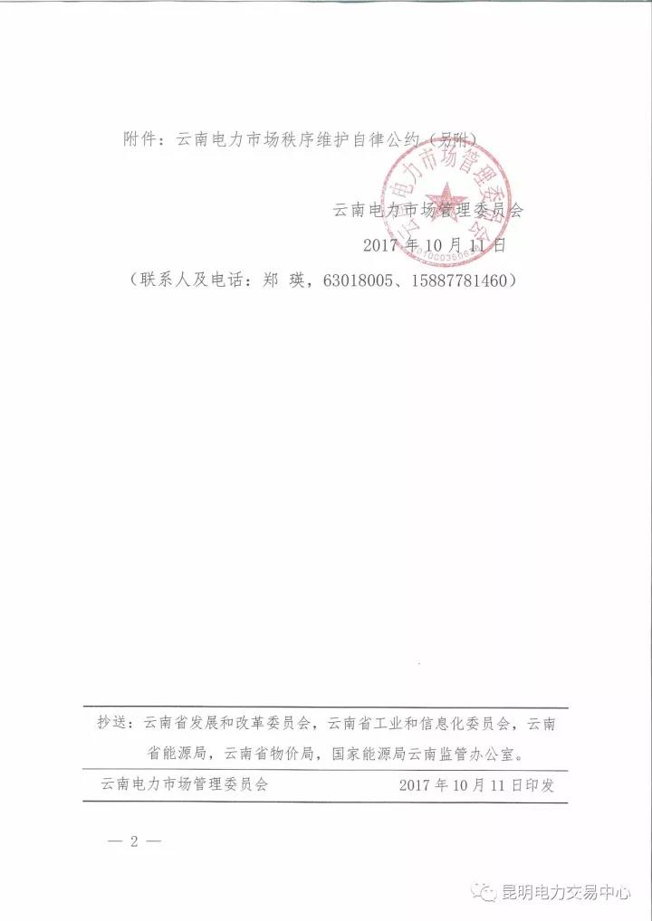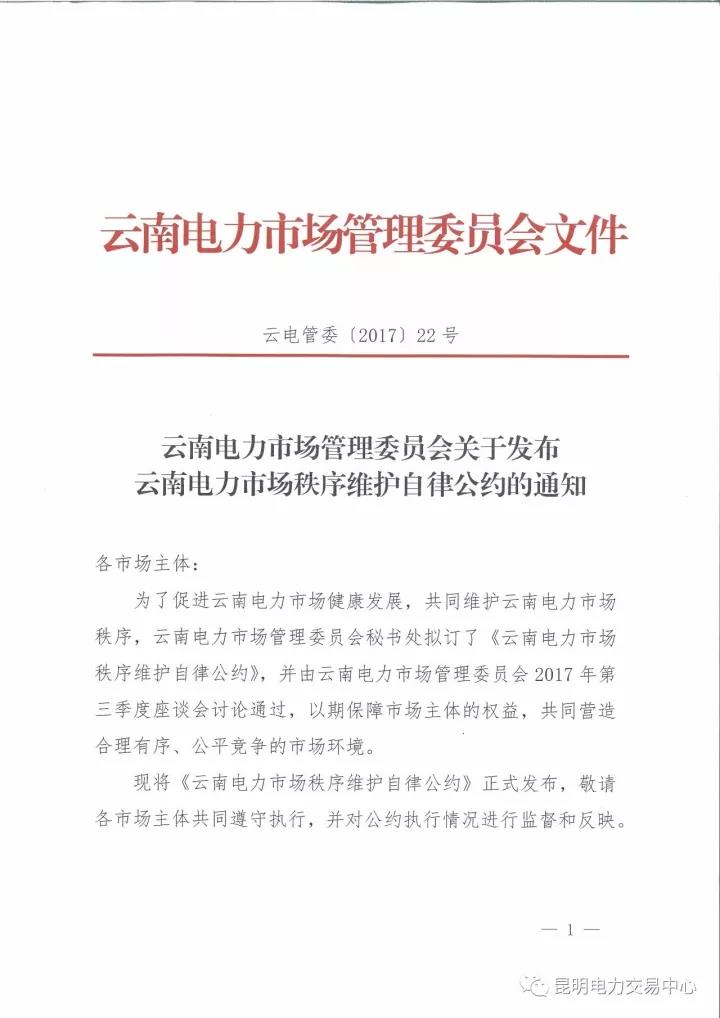 2017年10月11日,為了促進云南電力市場公平有序競爭,共同維護云南電力市場秩序,云南電力市場管理委員會發(fā)布《云南電力市場秩序維護自律公約》。