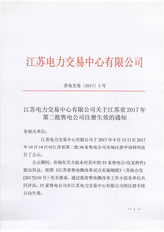 10月16日,江蘇電力交易中心發(fā)布了關(guān)于2017第二批售電公司公示結(jié)果的公告 ,2017年9月15日至2017年10月14日對(duì)受理注冊(cè)的35家售電公司公示,所有35家售電公司(名單見(jiàn)附件)在江蘇電力交易中心的注冊(cè)手續(xù)自動(dòng)生效。