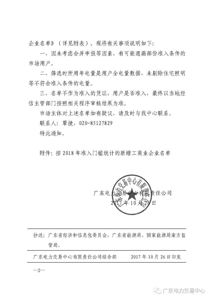 10月26日,廣東電力交易中心對全省電力用戶2016年的年度用電量進行了初步統(tǒng)計,篩選出按2018年準入門檻統(tǒng)計的新增工商業(yè)企業(yè)名單,印發(fā)了《關于發(fā)布按2018年準入門檻統(tǒng)計的新增工商業(yè)企業(yè)名單的通知》,按照《廣