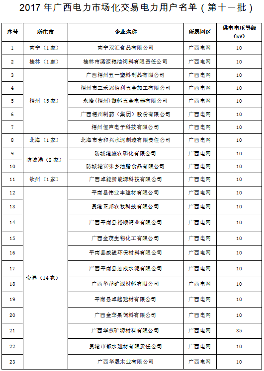 關(guān)于擬列入2017年廣西電力市場(chǎng)化交易電力用戶準(zhǔn)入名單(第十一批)的公示