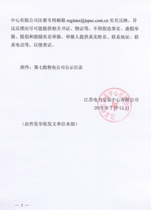 江蘇電力交易中心日前發(fā)布了《關于公示第七批受理注冊售電公司相關信息》的公告,公告中稱,江蘇電力交易中心受理了26家售電公司提交的注冊申請,公示期為2018年1月12日至2018年2月11日,時間1個月。詳情如下: