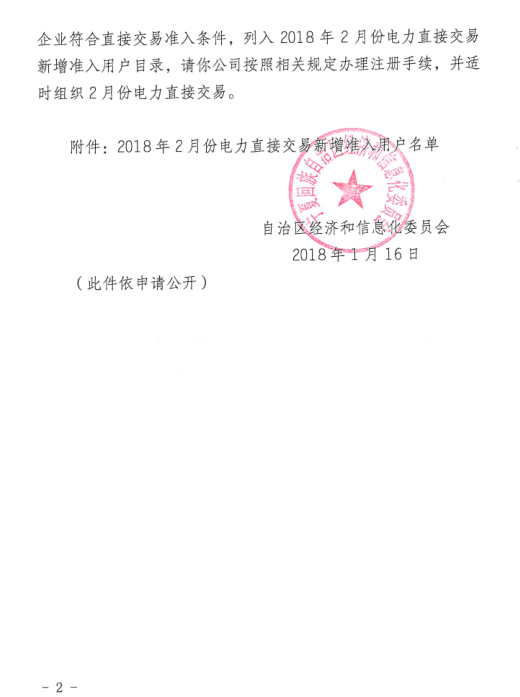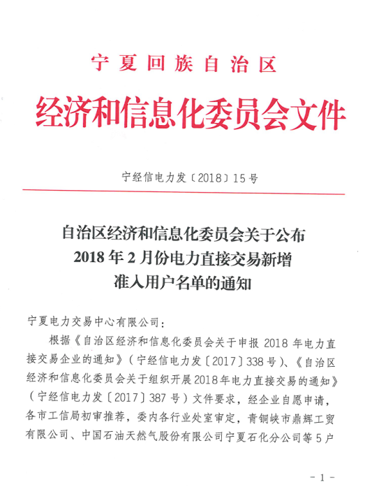 寧夏2018年2月電力直接交易新增準(zhǔn)入用戶名單