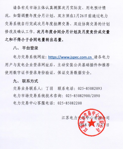 江蘇電力交易中心日前發(fā)布《江蘇2018年2月份合同轉(zhuǎn)讓交易公告》,公告指出:發(fā)電企業(yè)和電力用戶交易時(shí)間為2018年1月25日上午9:30至11:30。