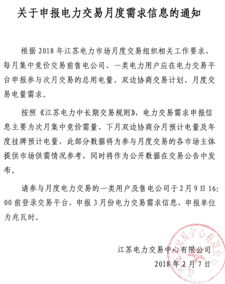 江蘇電力交易中心日前發(fā)布了《關(guān)于申報(bào)電力交易月度需求信息的通知》, 通知中稱,請(qǐng)參與月度電力交易的一類用戶及售電公司于2月9日16:00