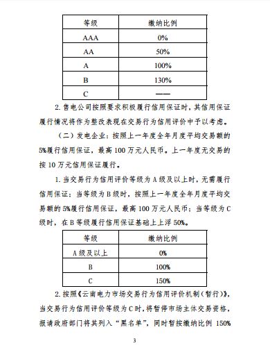 三是保證額度與交易行為信用評價(jià)掛鉤。信用保證履行要求和保證額度與云南電力市場主體交易行為信用評價(jià)結(jié)果聯(lián)動(dòng),實(shí)現(xiàn)基于基準(zhǔn)繳納等級,隨等級上升下調(diào)所需保證額度、等級下降則上調(diào)所需保證額度。