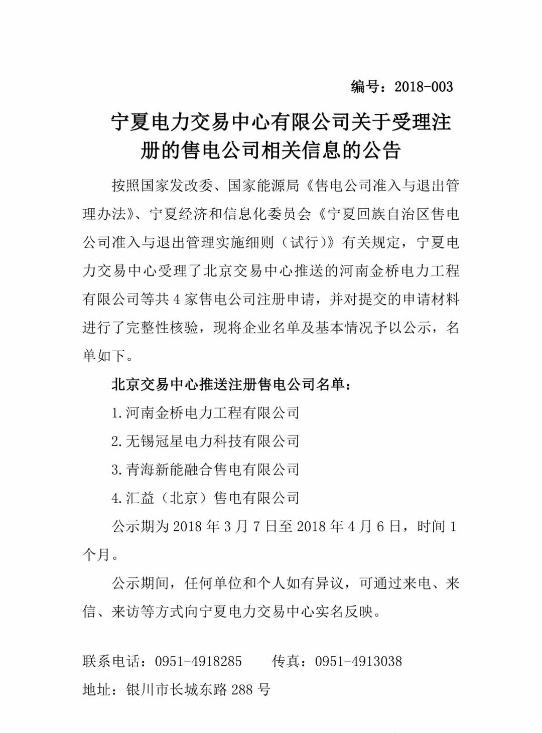 寧夏2018年3月新公示4家售電公司