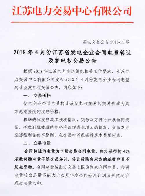 江蘇電力交易中心日前發(fā)布了《2018年4月江蘇省發(fā)電企業(yè)合同電量轉(zhuǎn)讓及發(fā)電權(quán)交易公告》,公告中稱,合同轉(zhuǎn)讓的電量為市場交易合同電量,售