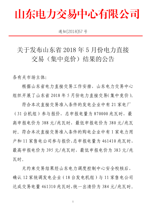 山東電力交易中心日前發(fā)布了《2018年5月份電力直接交易(集中競價)結果的公告》,經確認12家統(tǒng)調發(fā)電企業(yè)(18臺發(fā)電機組)與11家售電公司達成交易電量461310兆瓦時,統(tǒng)一出清價為384元/兆瓦時。
