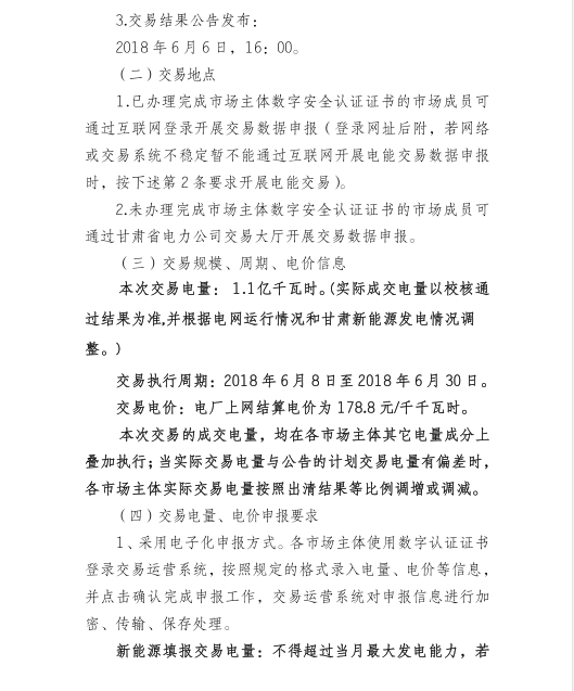 甘肅電力交易中心日前發(fā)布了《2018年6月甘肅送江西月度省間外送交易公告》,本次交易電量:1.1億千瓦時(shí)。( 實(shí)際成交電量以校核通過結(jié)果為準(zhǔn), 并根據(jù)電網(wǎng)運(yùn)行情況和甘肅新能源發(fā)電情況調(diào)整。)交易執(zhí)行周期:2018 年6月8日至2018年6月30日。交易電價(jià):電廠上網(wǎng)結(jié)算電價(jià)為178. 8元/ 千千瓦時(shí)。本次交易的成交電量,均在各市場(chǎng)主體其它電量成分上疊加執(zhí)行; 當(dāng)實(shí)際交易電量與公告的計(jì)劃交易電量有偏差時(shí) ,各市場(chǎng)主體實(shí)際交易電量按照出清結(jié)果等比例調(diào)增或調(diào)減。詳情如下: