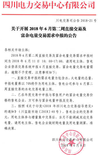 關(guān)于開展2018年6月第二周直接交易及富余電量交易需求申報的公告
